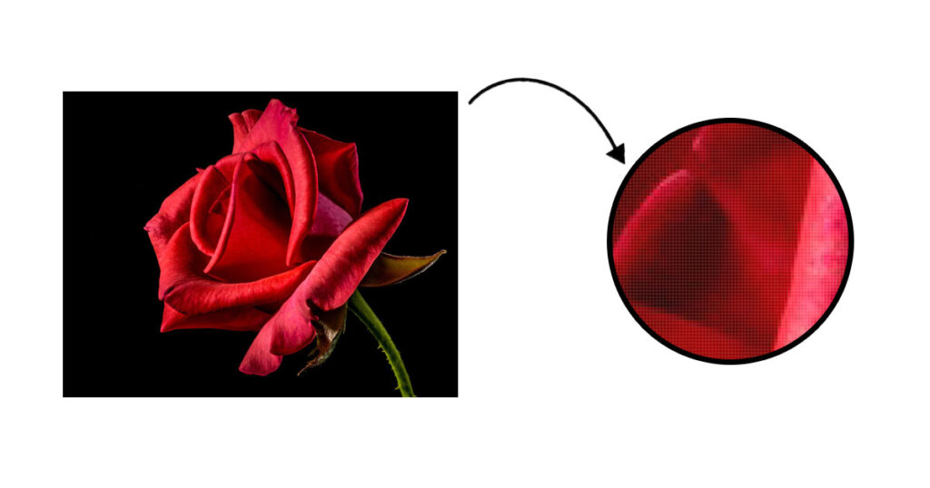 Raster images are made up of pixels. A pixel is a tiny square of colour that forms the complete picture. An image has many pixels, and each pixel contains colour information. The total number of pixels determines the image resolution. The higher the number of pixels, the higher the resolution.
